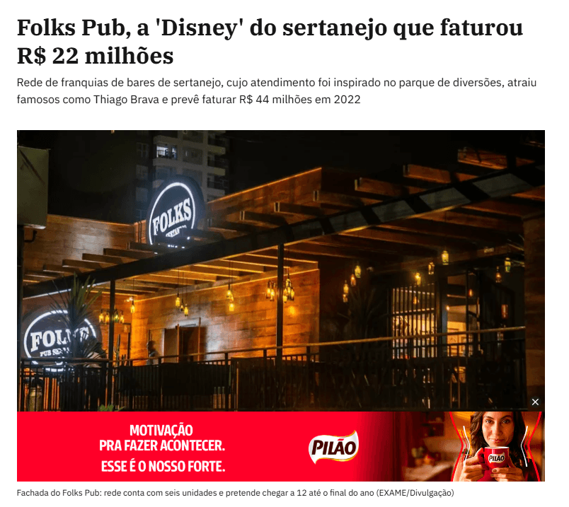 O Folks Pub é uma rede Pub Sertanejo que está consolidada no mercado há mais de 10 anos. Especializada em entretenimento e inspirada das publics houses britânicas, porém com traços folk, decoração rústica, cervejas, drinques personalizados e petiscos, somados à alta energia que a música sertaneja proporciona.